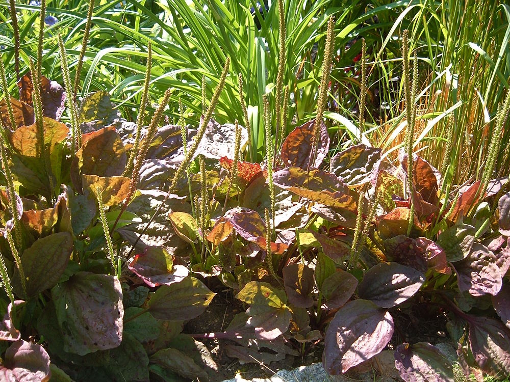 Vom Breitwegerich gibt es einige attraktive Züchtungen, die aber fast nur in professionellen Gärtnerkreisen bekannt sind. Darunter ist auch diese auffällige, rotblättrige Sorte. Sowohl in Kombination mit Einjährigen, aber auch im Vordergrund von Staudenrabatten ist der Wegerich als Farbgeber eine attraktive Erscheinung. Der Wegerich kommt mit beinahe jedem Boden zurecht, ideal sind nahrhafte, feuchtere Böden, die Blätter werden dann besonders groß. Auf trockeneren Böden bleibt die Pflanze in allen Teilen kleiner, die Blätter sind dann aber intensiver rot. Das Foto stammt vom Botanischen Garten in Ulm.