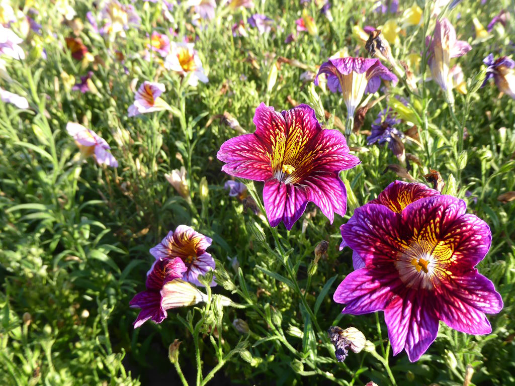 Salpiglossis stammen aus den südamerikanischen Anden und sind seit Mitte des 19. Jahrhunderts als edle, auffällige Sommerblumen beliebt in Europa. Am Grunde des Schlundes sind sie goldgelb, was einen schönen Kontrast ergibt. In der Farbpalette dominieren orange, gelbe und rot(violette) Töne. Verwendung in Sommerflorrabatten und Pflanzgefäßen, als Schnittblumen bis zu 7 Tage haltbar !